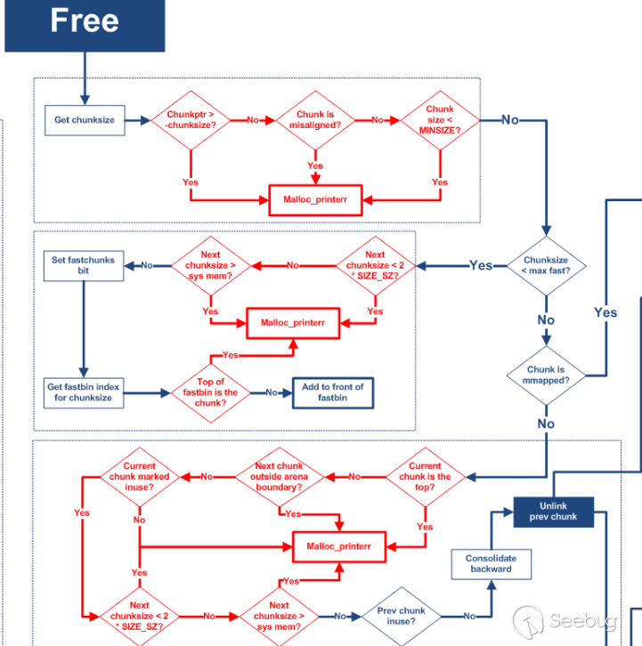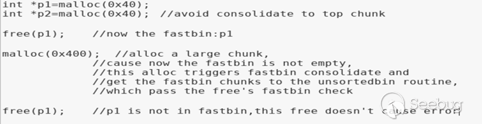 從下圖free的流程中我們可以看出free時只會檢查釋放fastbin大小的堆時被釋放的堆是否和fastbin的頭結點是否一致,而在申請0x400的largechunk時,fastbin鏈表非空,fastbin中的堆會進行合并并且進入unsortedbin的處理流程,在unsortedbin的處理流程中符合fastbin大小的堆會被放入smallbin,這樣就繞過了free時對fastbin頭結點的檢查,從而可以構成一次對fastbin大小的堆的doublefree。