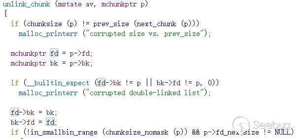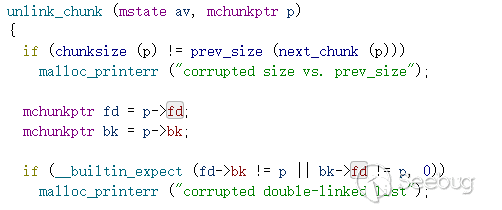 下面分析下unsafeunlink是如何導致任意地址寫的。閱讀源碼可以發現smallbin范圍內非fastbin范圍的堆在unlink時只檢查了雙向鏈表的完整性,然后執行了雙向鏈表摘除節點的操作。