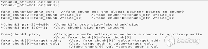 需要注意的是,我們構造的fake chunk的起點是chunk0的數據部分即fd,fake chunk的prev size和size域正常賦值即可(最新的libc加入了cur_chunk’size=next_chunk’s prev_size),fake chunk中關鍵的部分是fake data,這一部分要繞過unlink雙向鏈表斷鏈的檢查,即fd->bk=p&&bk->fd=p