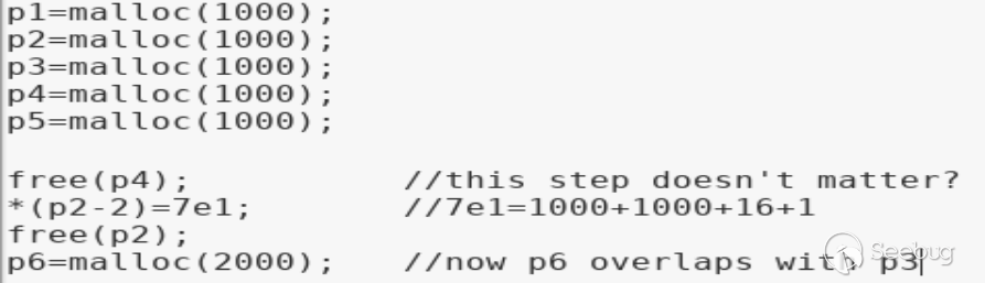 此時由于物理相鄰的前向堆p4處于空閑態,fake p2會和p4合并鏈入largebin。然后申請2000大小的largechunk會將上述合并后的堆切割后返回p2起始的堆,從而構成一次堆重疊。