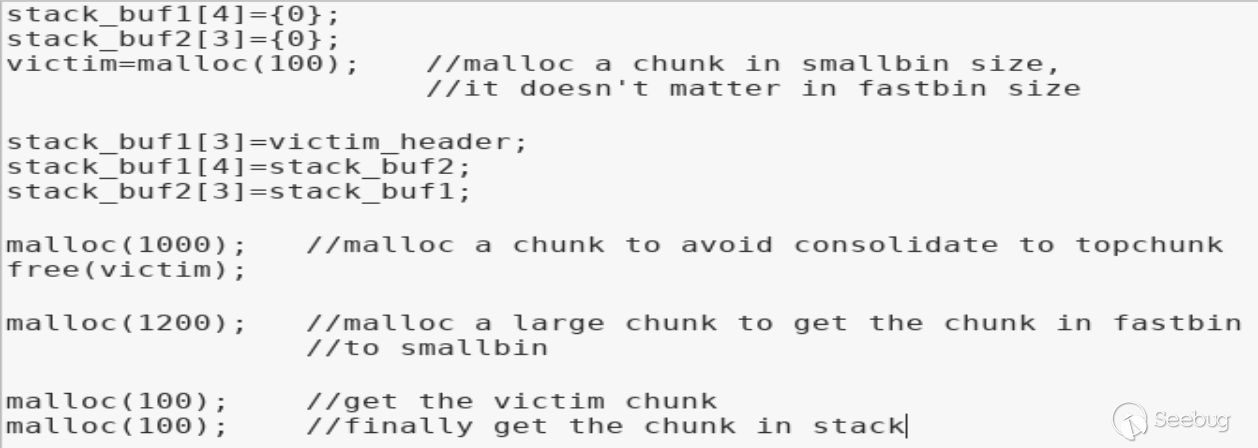 這樣此時再申請一個victim大小的堆直接取smallbin的bk指向的stack_buf1即得到相應地址處的堆,達到了任意地址分配內存的效果。