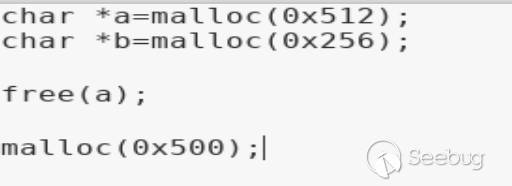 Shellphish給出的例子中先申請了0x512和0x256大小的兩個堆,然后釋放掉0x512大小的堆(申請0x256大小的堆的作用是避免釋放不是mmap分配的堆a的時候合并到topchunk),實例中再次申請0x500大小的堆由于largebin的best fit分配策略glibc會分割堆后返回堆a,即堆c等價于堆a,這時我們輸出堆a的內容即輸出修改后的堆c的內容。