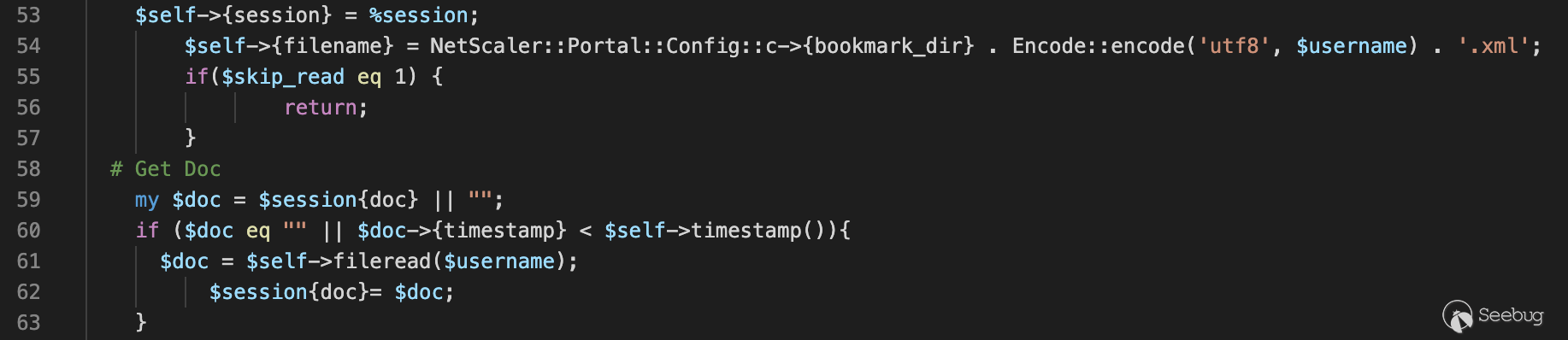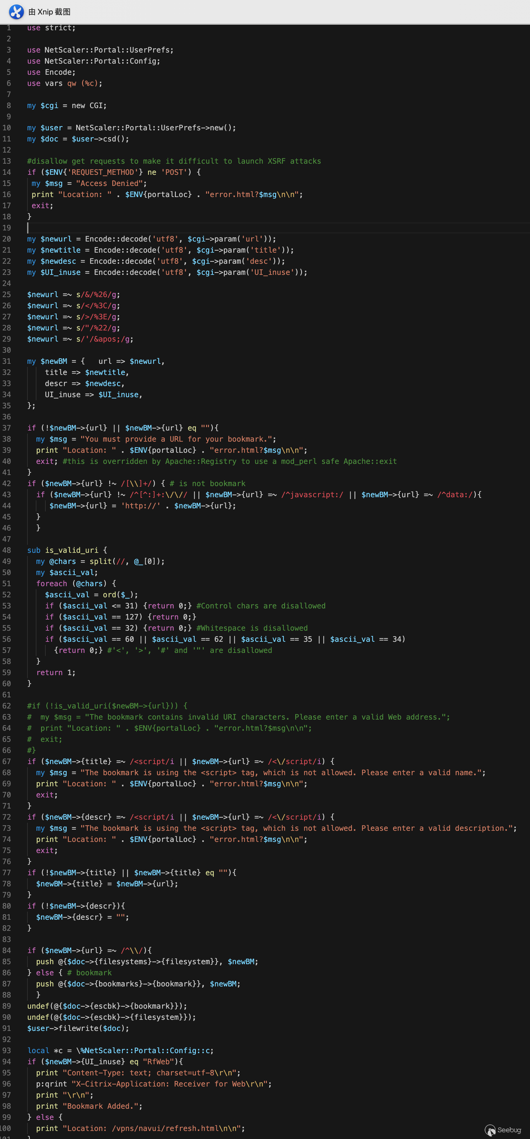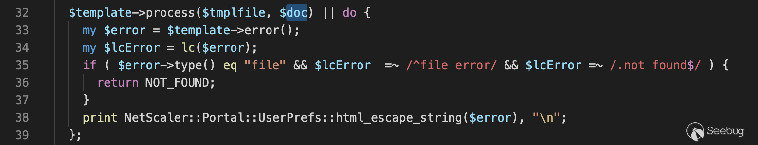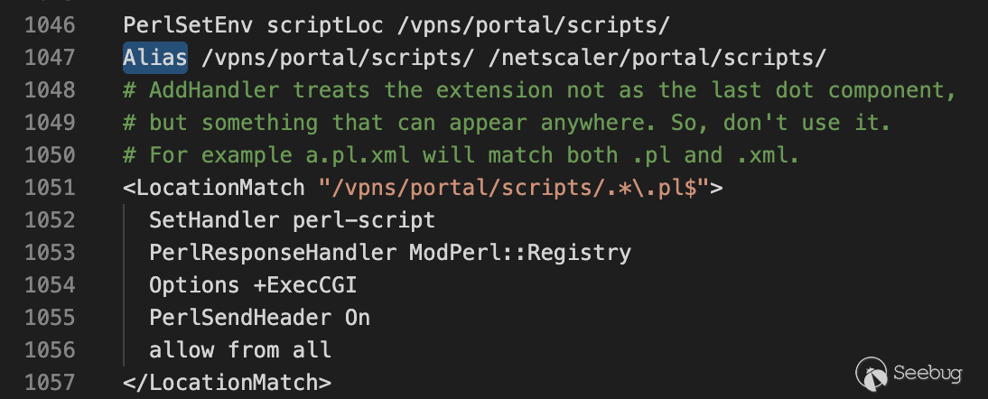我們經過一段時間查看源碼發現了一個有利用價值的perl程序,即請求路徑為“/vpns/portal/scripts/newbm.pl”實際物理路徑為"/netscaler/portal/scripts/newbm.pl"的newbm模塊。通過下圖我們可以看到在http.conf中配置 Alias的作用是別名配置