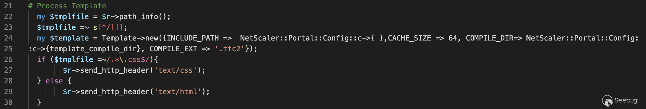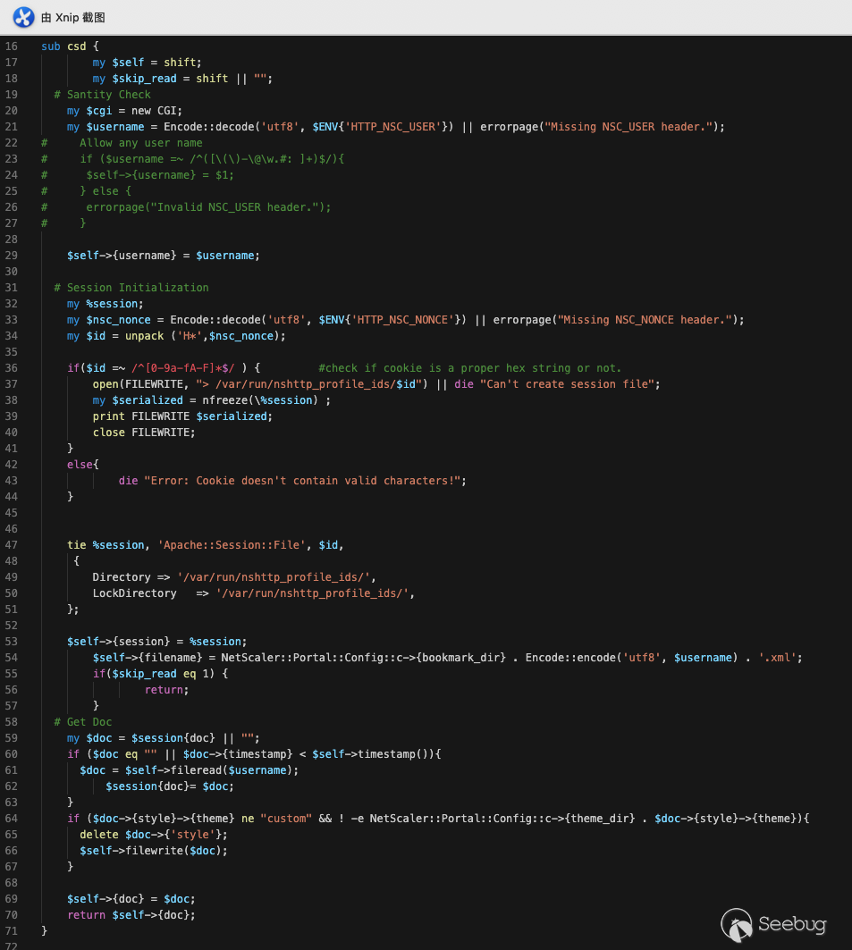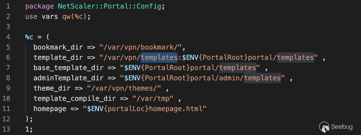 按照順序來,我們先考慮如何可以訪問這個xml文檔。首先第一反應就是去看http.conf文件,生成的xml文檔的物理路徑是“/netscaler/portal/templates/” 看一看有沒有該路徑的一個映射地址,這樣我們就可以直接訪問了,可惜并沒有,也就是說像exp第一步直接訪問newbm.pl的方式是行不通了。但是此時我們回到一開始的原點,即訪問路徑“/vpns/portal/”的默認處理模塊 Handler.pm
