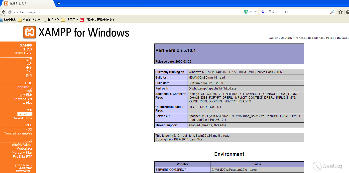 配置完Apache和Perl模塊后,可以用perlinfo函數查看系統環境相關變量。下圖是在虛擬機中跑出來的效果,用的是XAMPP套件的老版本。