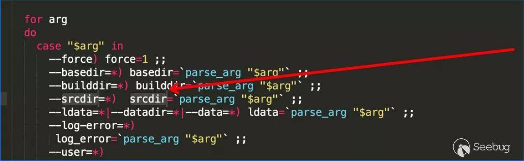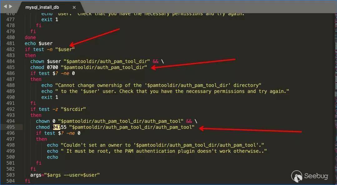 這里配置了auth_pam_tool文件為0(root)所有權,4755文件權限(4為suid權限)。想要進入這個漏洞點需要$srcdir變量值長度為0才能觸發。