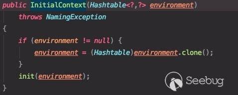這里有個很重要的參數environment,在該參數中可以設置Context的靜態變量來指定Context的初始化參數,包括JNDI_FACTORY、PROVIDER_URL。這些初始化參數在后續的流程中有極其重要的作用。