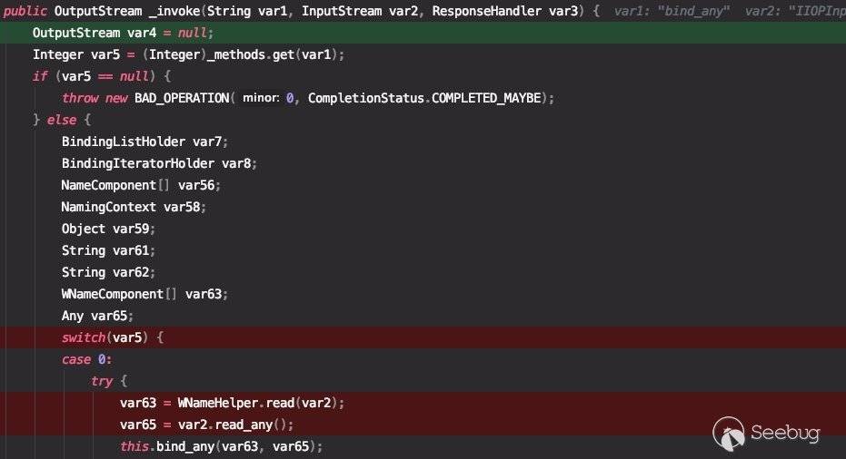 熟悉CORBA的同學肯定一眼就能看出這里完成的是生成IOR,同時設定corba協議中的數據類型與java類型交互的約定為tk_value,并設定請求的op或者叫做operation為bind_any。這里不僅僅設定了服務端對注冊請求的處理方式(bind_any的處理流程),同時設定了后面反序列化的方式(tk_value)。