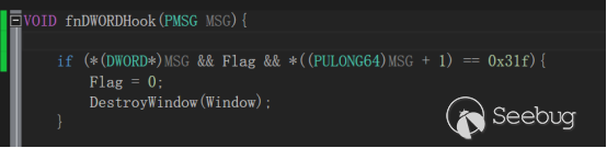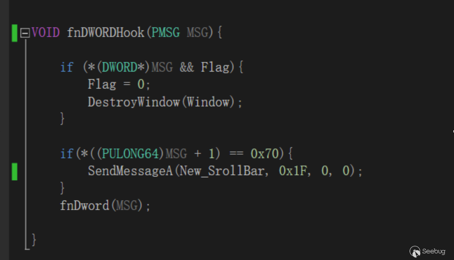 fnDword()函數內判斷發送的Message是否為0x70,如果是,則向新創建的滾動條控件發送0x1F號消息 - 向 滾動條子控件(Scroll)發送WM_LBUTTONDOWN消息即可觸發BSOD