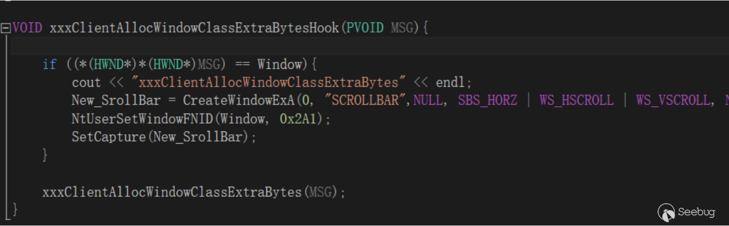 xxxClientAllocWindowClassExtraBytes()函數內調用NtUserSetWindowFNID()函數,并創建新的滾動條控件,使用SetCapture()函數修改滾動條捕獲窗口 - 在