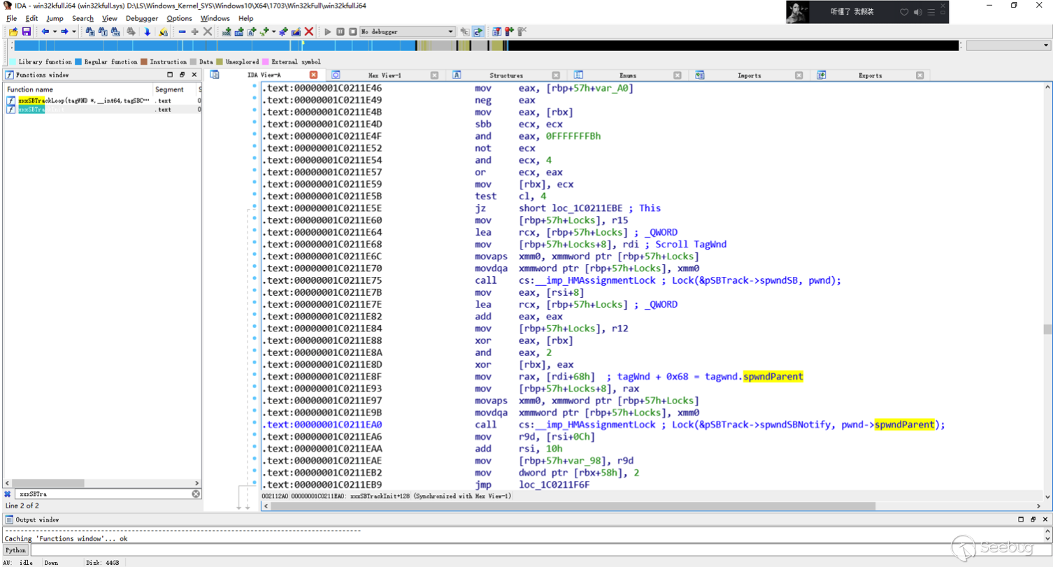 需要注意的是Lock(&pSBTrack->spwndSBNotify, pwnd->spwndParent),讓滾動條子控件引用父類窗口,也就是我們創建的父窗口建立引用+1,此處很重要(PS:當時寫Poc時創建滾動條子控件時,屬性忘記設置WS_CHILD,導致滾動條窗口的父窗口非創建的父窗口導致無法利用漏洞)