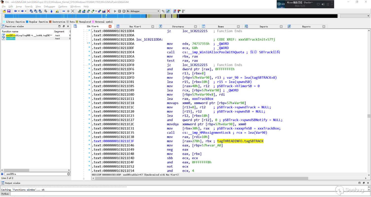 我們知道,向滾動條子控件(Scroll)發送WM_LBUTTONDOWN,消息時,會調用到win32kfull!xxxSBTrackInit()函數,該函數主要是來實現滾動條跟隨鼠標移動的,該函數首先會創建一個0x80字節大小的Session Pool,用來保存 tagSBTrack結構 接著將創建好tagSBTRACK結構的指針,寫入到tagTHREADINFO.tagSBTRACK處,在Windows10 1703 X64中,該結構的偏移地址為tagTHREADINFO+0x278