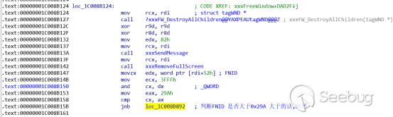 問題就在這里,由于釋放窗口要調用win32kfull!xxxFreeWindow函數,而FNID為釋放窗口的Flag屬性,被修改為0x82A1后,會再次調用fnDWORD函數回調R3,并發送為0x70的Message.