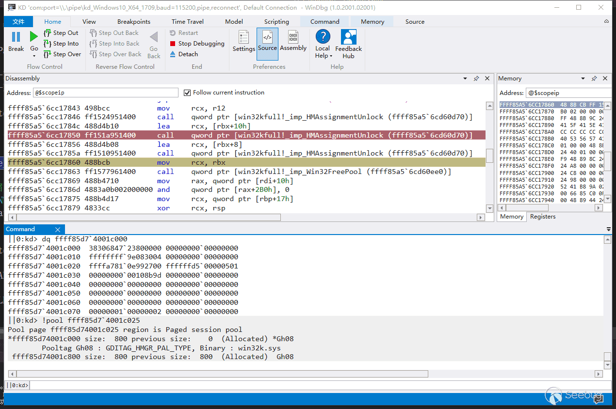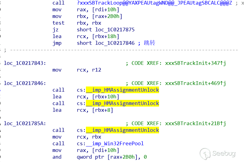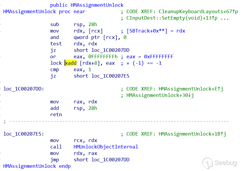 通過逆向win32kbase!HMAssignmentUnlock函數我們發現,該函數會將[[rcx]+8]處內存+(-1)也就是減1,正好我們可控rdx,這樣我們離System就更進了一步.