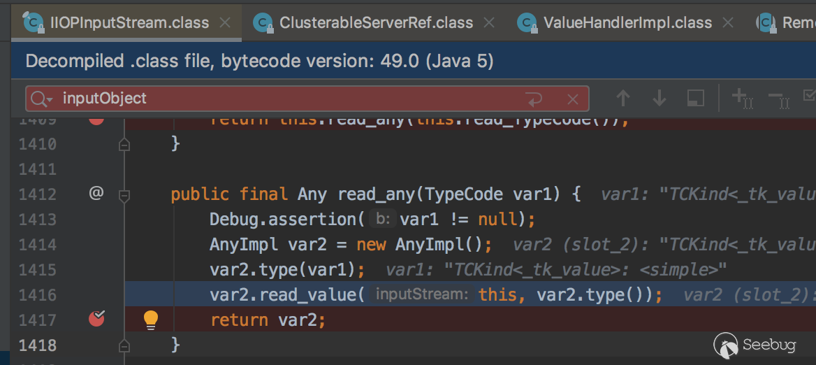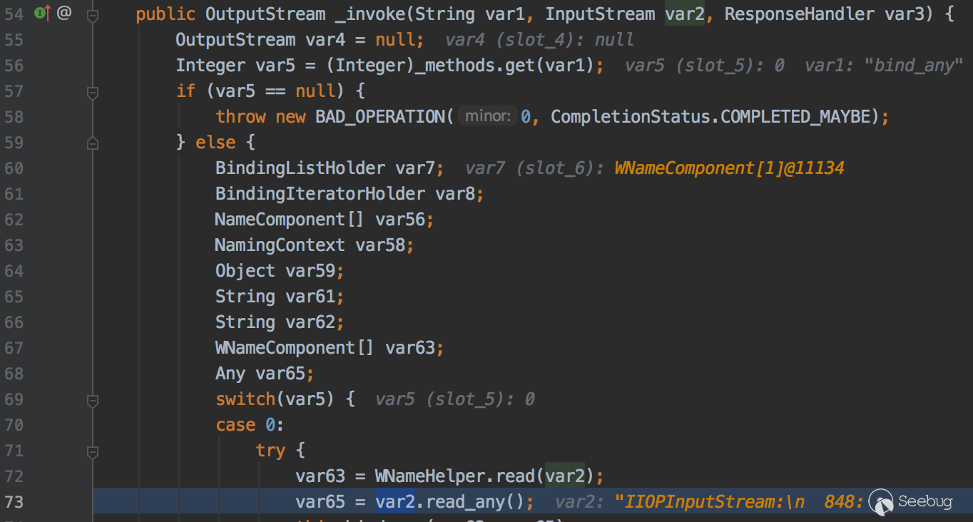 _NamingContextAnyImplBase.invoke方法中請求類型是bind_any,對應var5的值為0,會執行var2.read_any(),var2的值是IIOPInputStream.