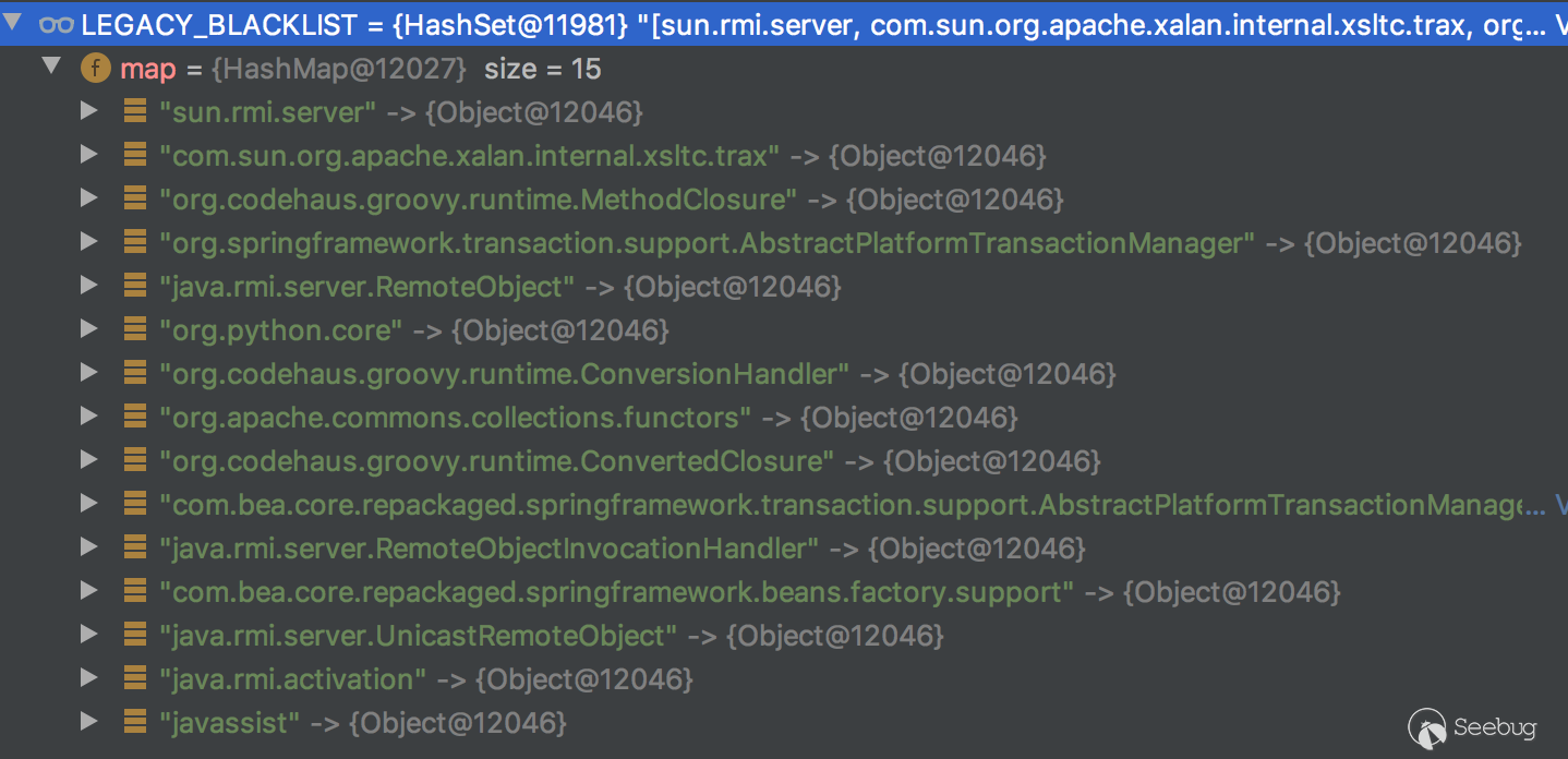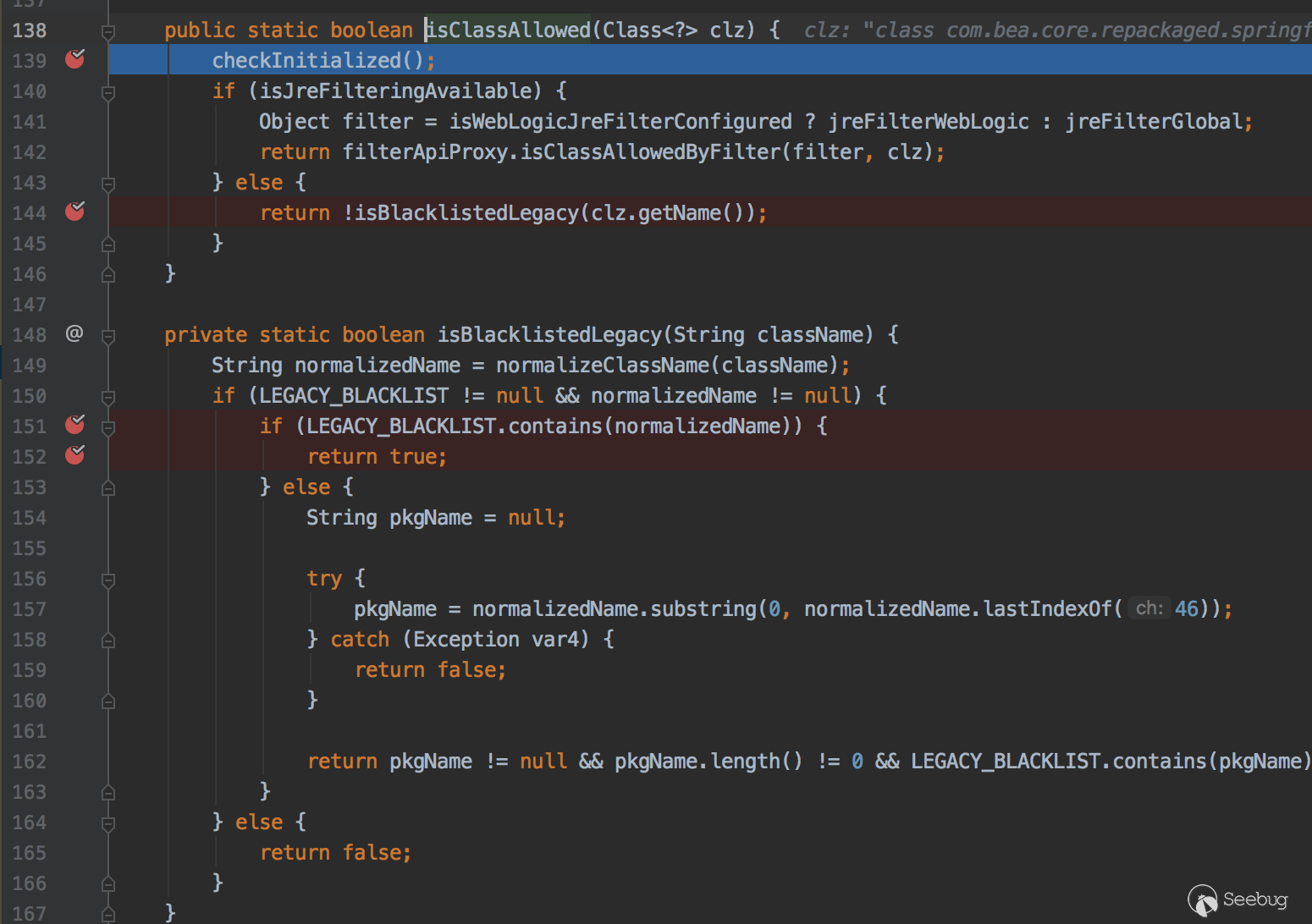 可以看到JtaTransactionManager父類AbstractPlatformTransactionManager在黑名單列表里面,第一個斷點處verifyClassPermitted方法的for循環會循環判斷父類,所以會拋出黑名單異常警告。