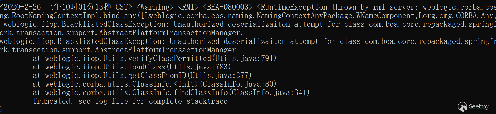 經過分析這次漏洞主要原因是錯誤的過濾JtaTransactionManager類,JtaTransactionManager父類AbstractPlatformTransactionManager在之前的補丁里面就加入到黑名單列表了,T3協議使用的是resolveClass方法去過濾的,resolveClass方法是會讀取父類的,所以T3協議這樣過濾是沒問題的。但是IIOP協議這塊,雖然也是使用的這個黑名單列表,但不是使用resolveClass方法去判斷的,這樣默認只會判斷本類的類名,而JtaTransactionManager類是不在黑名單列表里面的,它的父類才在黑名單列表里面,這樣就可以反序列化JtaTransactionManager類了,而JtaTransactionManager類是存在jndi注入的。