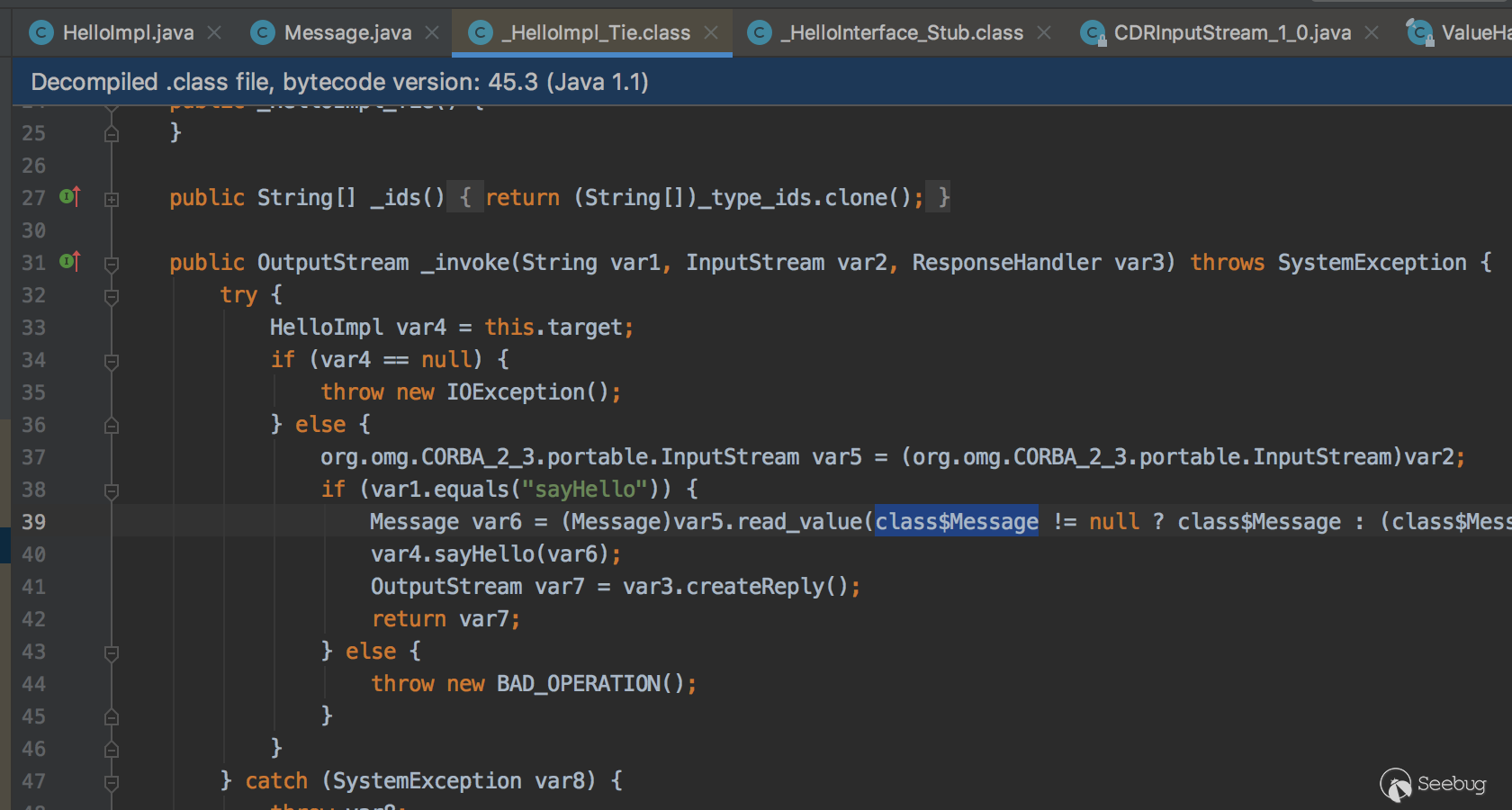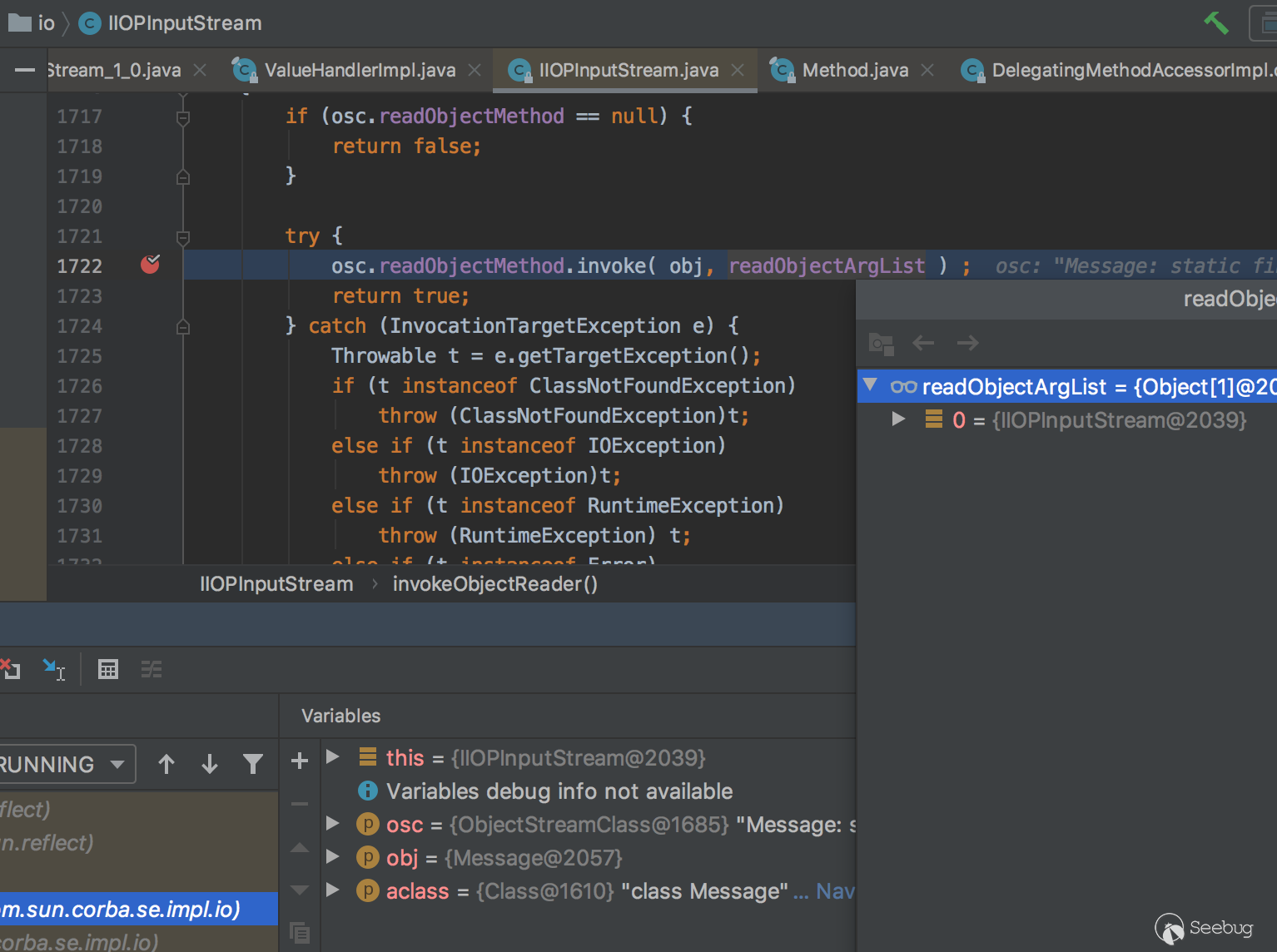 _HelloImpl_Tie有一個_invoke方法,讀取流中的數據去執行CDRInputStream.read_value方法。然后會執行IIOPInputStream.invokeObjectReader方法,這個方法會反射執行Message.readObject方法,參數屬性也是IIOPInputStream類型。