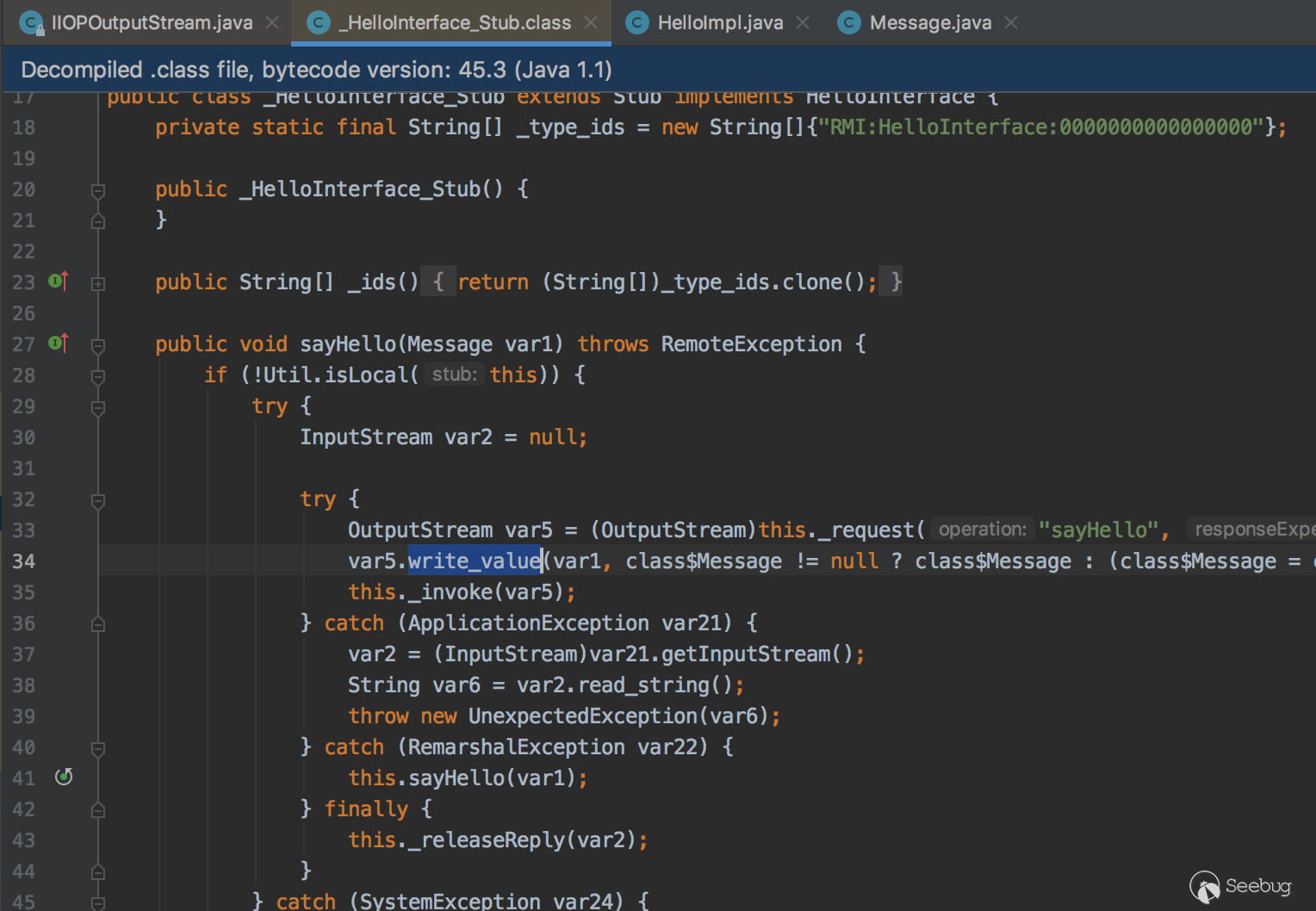 sayHello方法會從request中獲取數據,然后執行CDROutputStream.write_value方法會執行到IIOPOutputStream.invokeObjectWriter方法