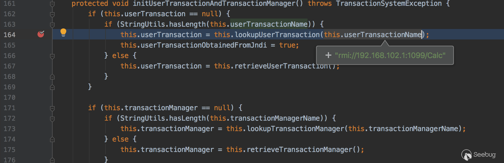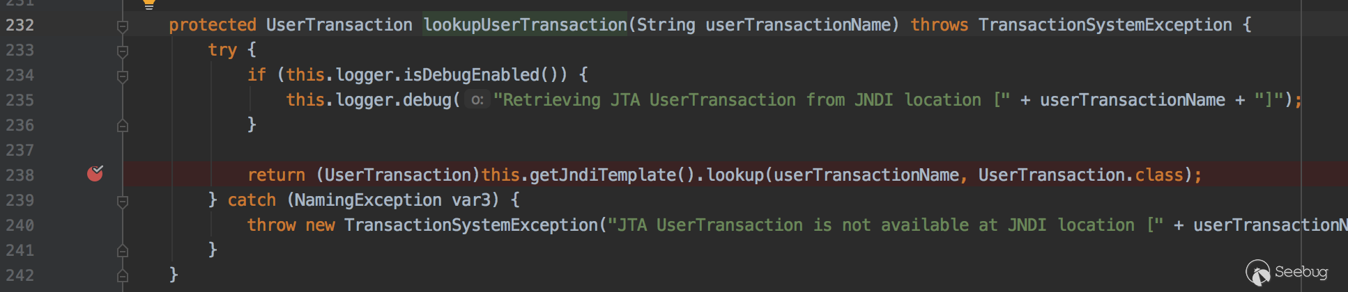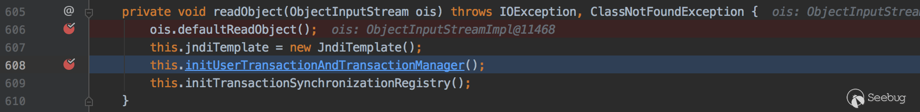 這里會反射調用,JtaTransactionManager.readObject方法。