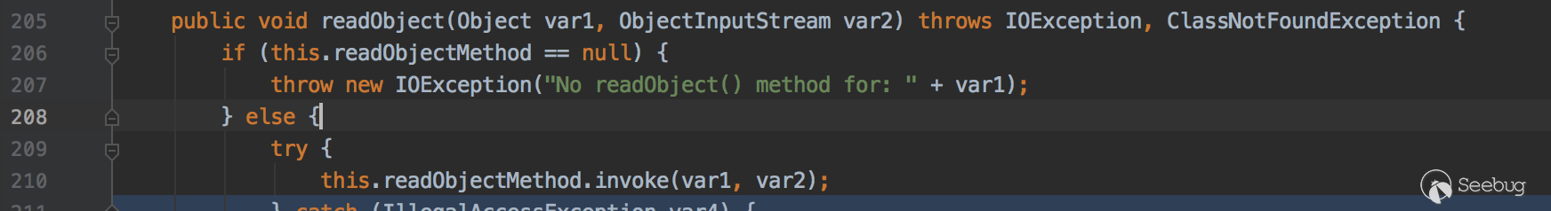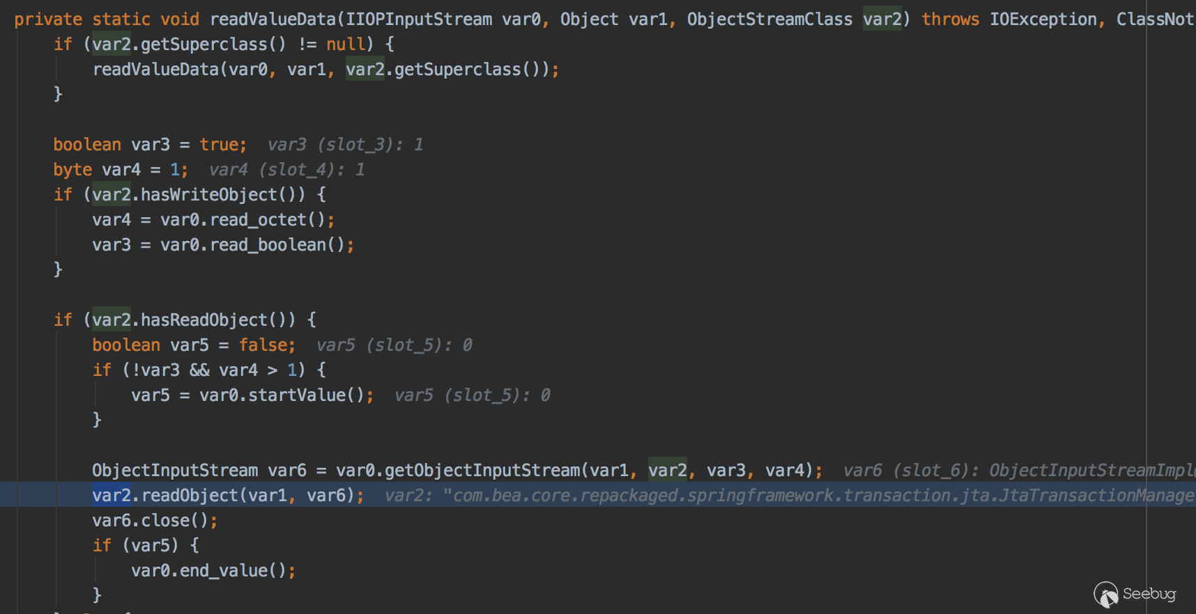 這里執var2是ObjectStreamClass類,var1是JtaTransactionManager對象,var6是JtaTransactionManager對象輸入流數據,會執行ObjectStreamClass.readObject方法