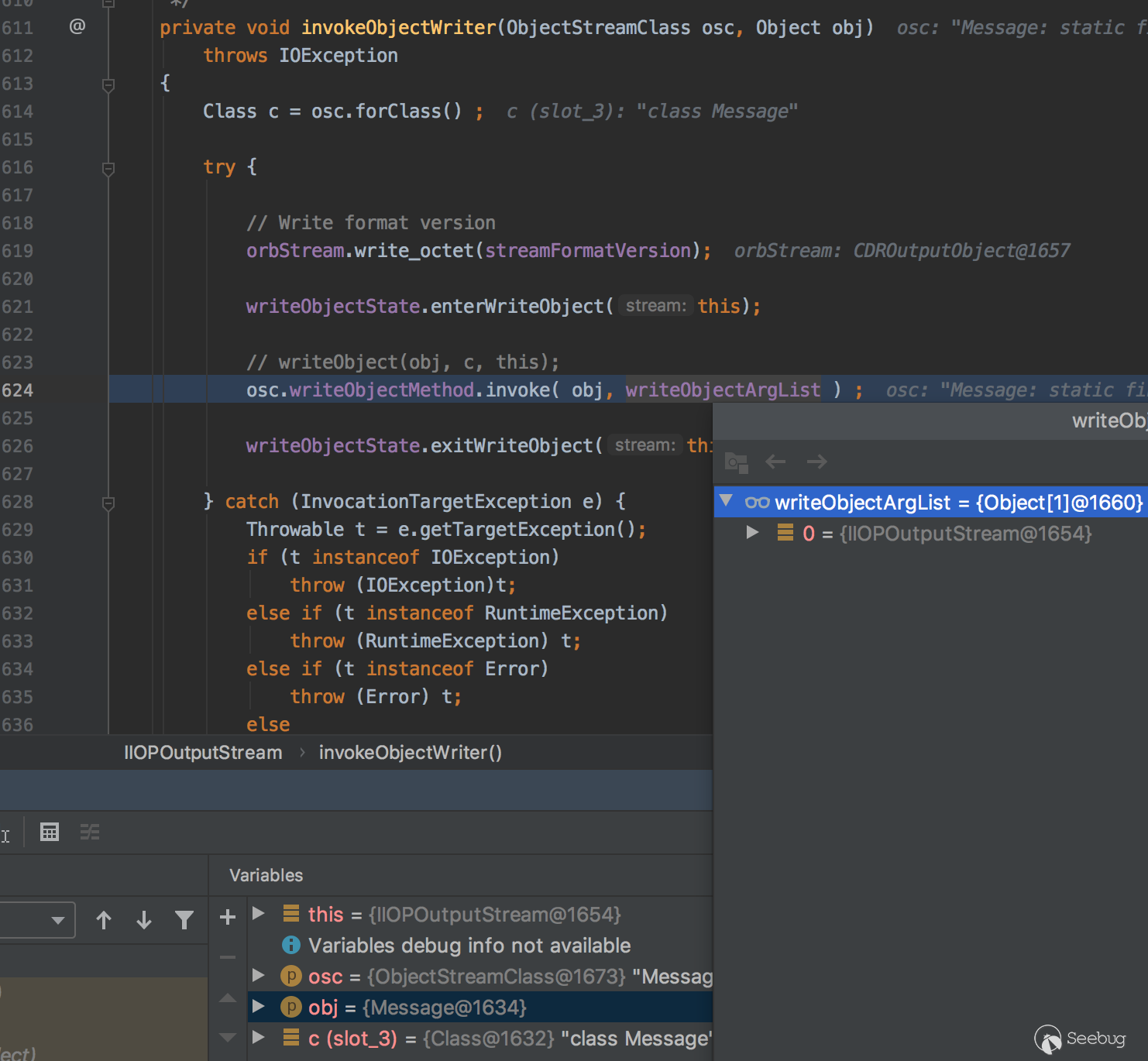 這里反射調用Message.writeObject方法,方法參數屬性是IIOPOutputStream類型,這也解釋了為什么前面抓包數據中沒有aced魔術頭。
