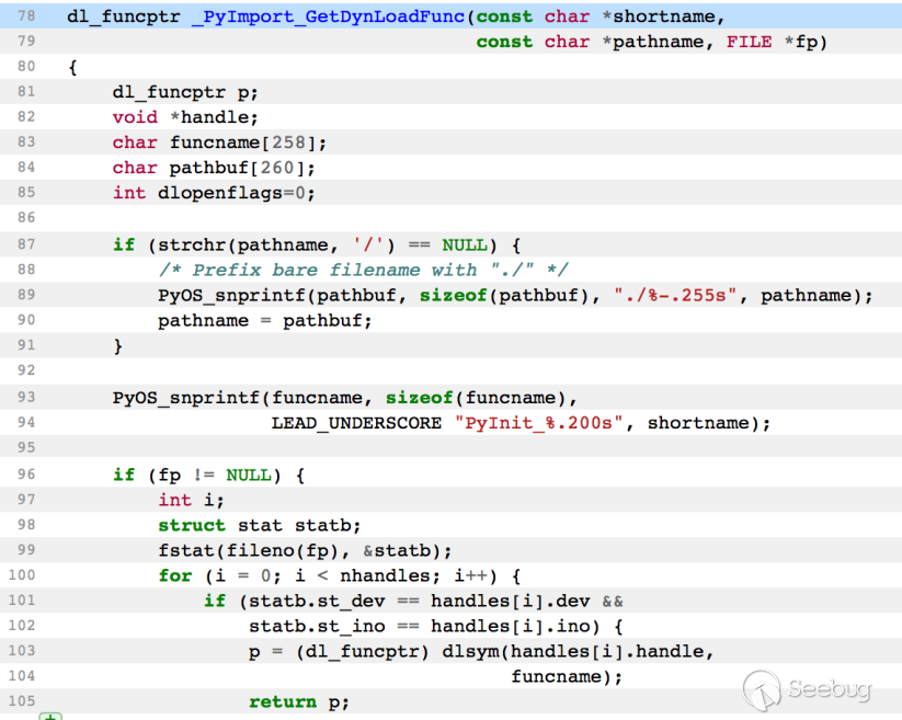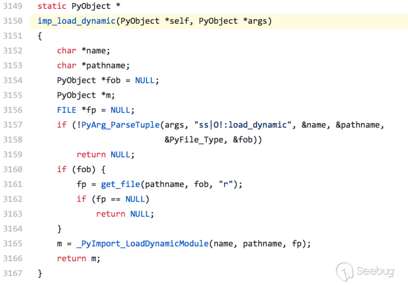 此外還發現,file參數存在的情況下,imp.load_dynamic會取得file的文件描述符’fp’,進而確定該文件的設備和inode編號,若已加載過該動態庫文件,最終會通過dlsym(filehandle,funcname)查找入口函數,并返回入口函數指針;