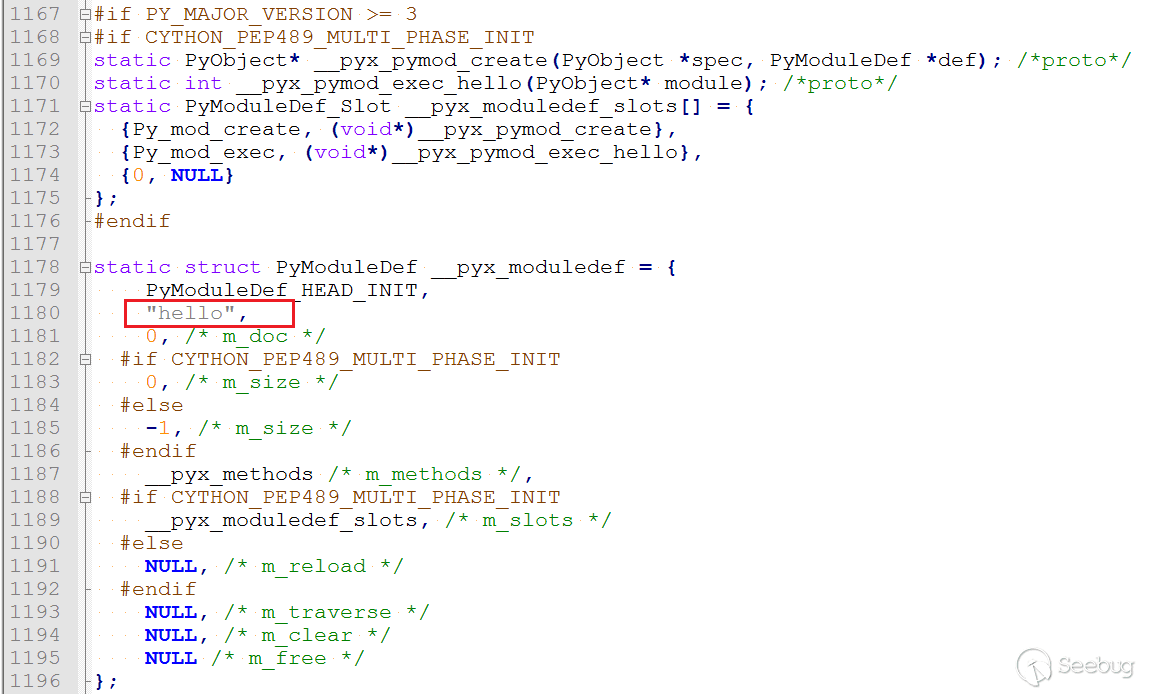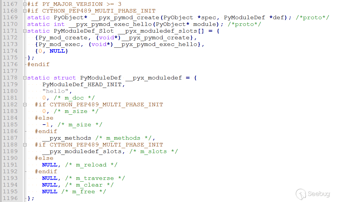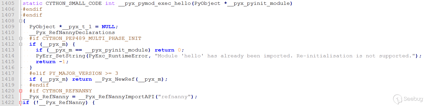 上述例子相對應的函數為:__pyx_pymod_exec_hello;