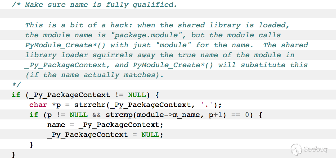 Python2中維持了一個 dictionary:extensions ,以pathname為key,用來記錄已經加載的動態庫,作用就是防止多次加載同一個動態庫執行其中的入口函數; imp.load_dynamic 會調用 _PyImport_LoadDynamicModule(), _PyImport_LoadDynamicModule() 會調用_PyImport_FindExtension() 來查詢 extensions 中緩存的 pathname 相對應的 module;如存在,就不會調用入口函數。