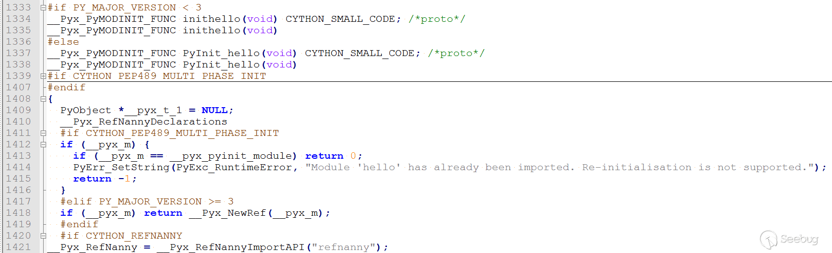 2.1中也提到single-phase initialization情況下,__pyx_pymod_exec_hello就是入口函數;