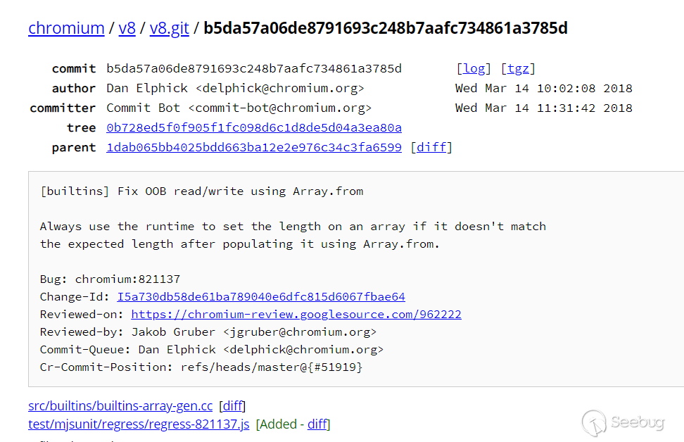 我們從漏洞的issue鏈接https://bugs.chromium.org/p/chromium/issues/detail?id=821137找到修復的commit鏈接https://chromium.googlesource.com/v8/v8.git/+/b5da57a06de8791693c248b7aafc734861a3785d,可以看到漏洞信息、存在漏洞的上一個版本(parent)、diff修復信息和漏洞poc(test/mjsunit/regress/regress-821137.js)