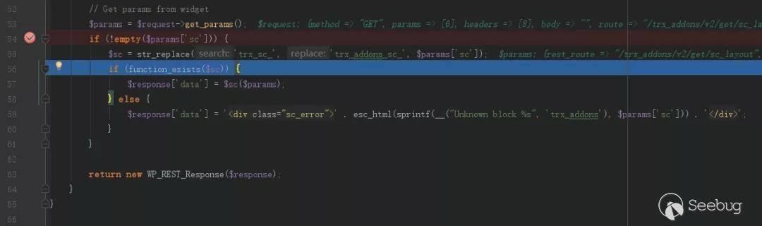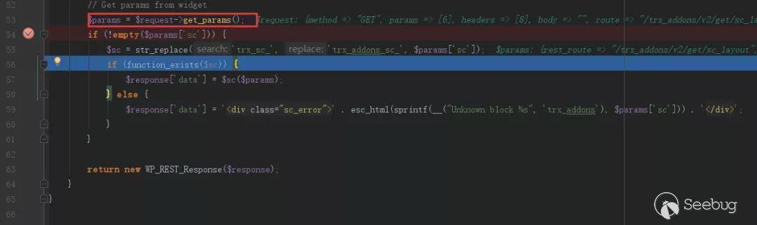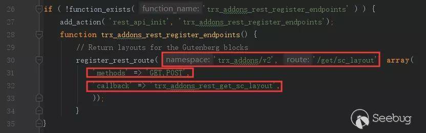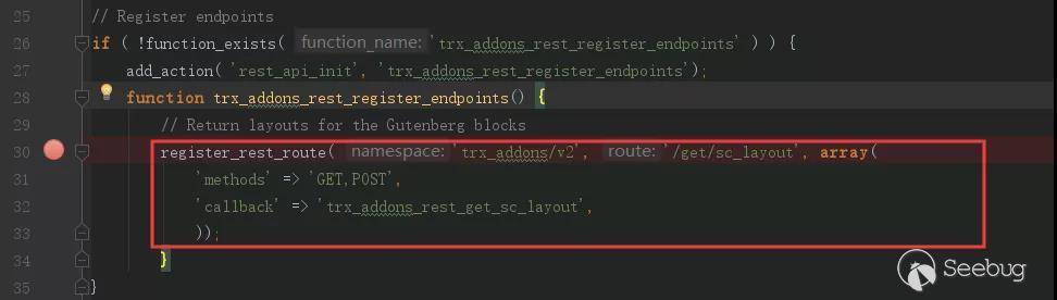 通過上圖第一個紅框處namespace以及route屬性值可知:該接口路由為trx_addons/v2/get/sc_layout;通過第二個紅框methods屬性值可知:該接口可以通過GET\POST方法訪問;通過第三個紅框callback屬性值可知:該接口回調函數為漏洞觸發點trx_addons_rest_get_sc_layout方法。通過上述信息,我們可以構造出通往漏洞觸發點的請求。