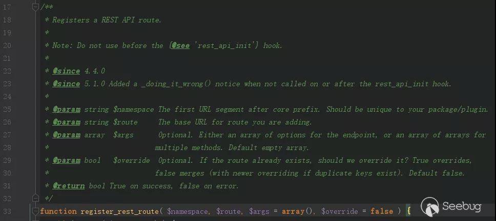 在介紹完register_rest_route方法后,我們回歸漏洞代碼,分析此處register_rest_route方法注冊的API接口