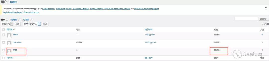 由此一來,wordpress中將會增添一個administrator權限的名為TEST的用戶,如下圖