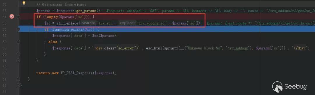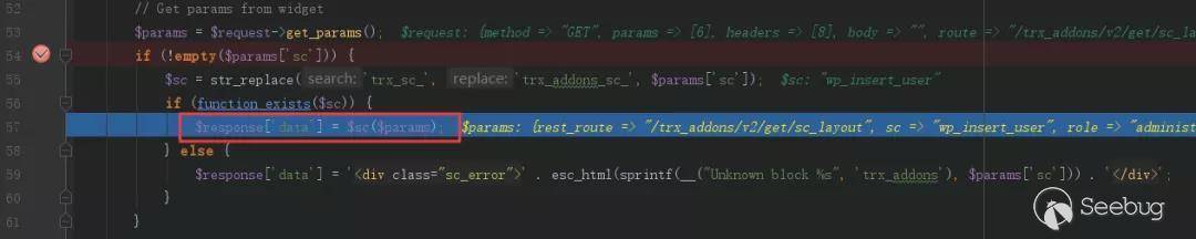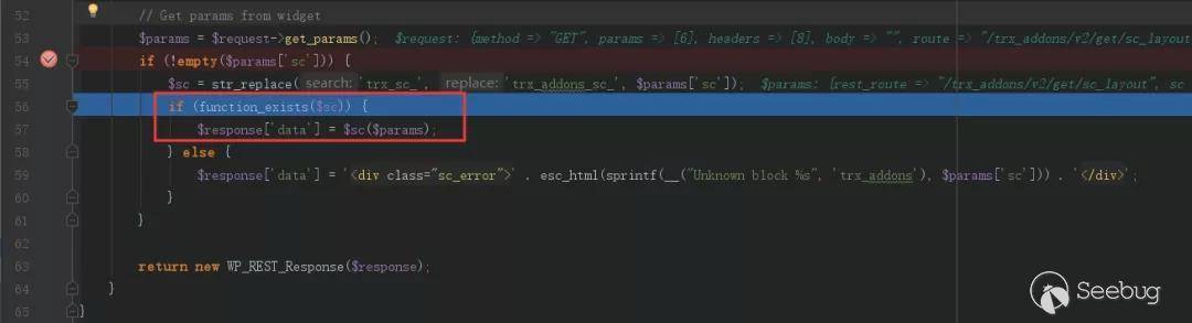 根據上文漏洞分析一章可知,該鏈接最終會觸發trx_addons_rest_get_sc_layout方法,見下圖