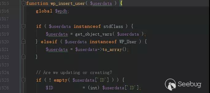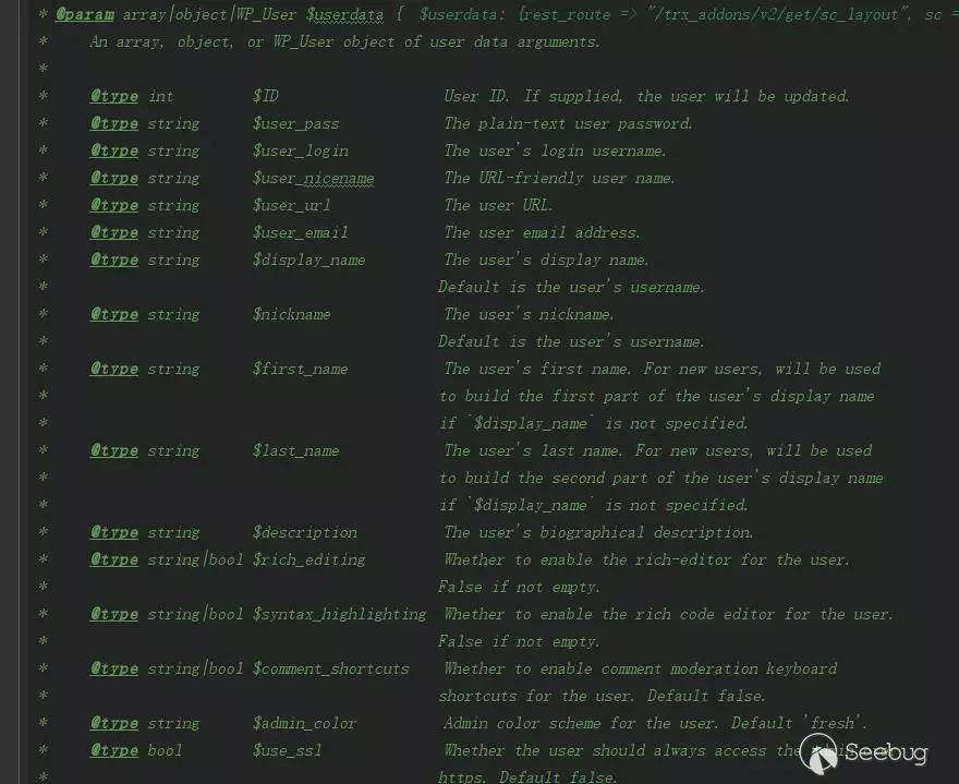 wp_insert_user方法可以為wordpress程序添加一個指定權限的用戶,該方法接收一個數組作為參數滿足觸發漏洞的要求,見下圖