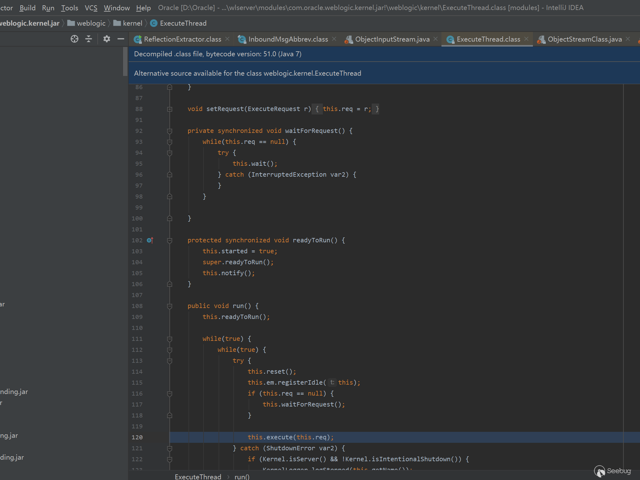 weblogic首先在moudle/com.oracle.weblogic.kernel.jar中 的ExexuteThread.class的run函數中監聽7001的連接,并調用execute方法去處理請求,也就是req,如圖
