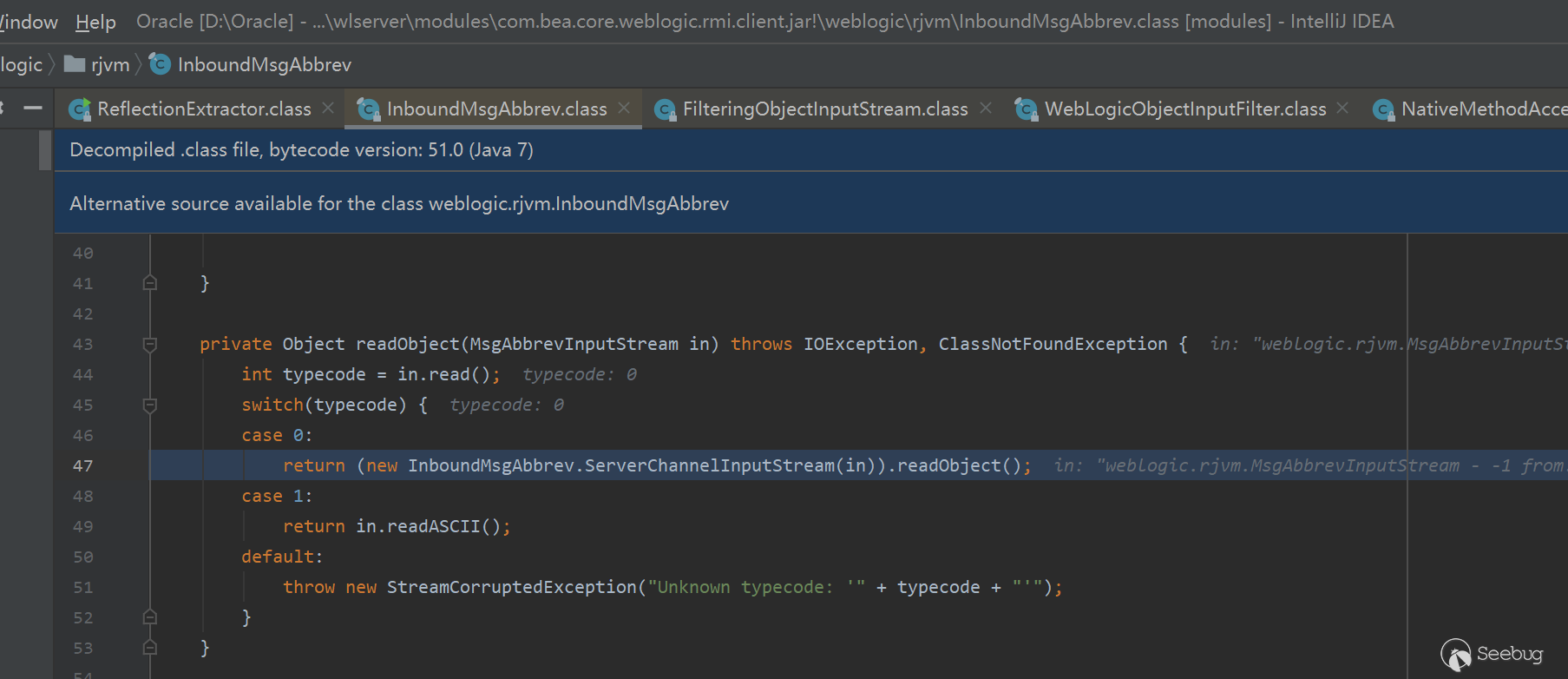 可以看出,weblogic早就通過黑名單過濾的方式,禁止該類工具的攻擊。下面我們分析一下T3反序列化漏洞