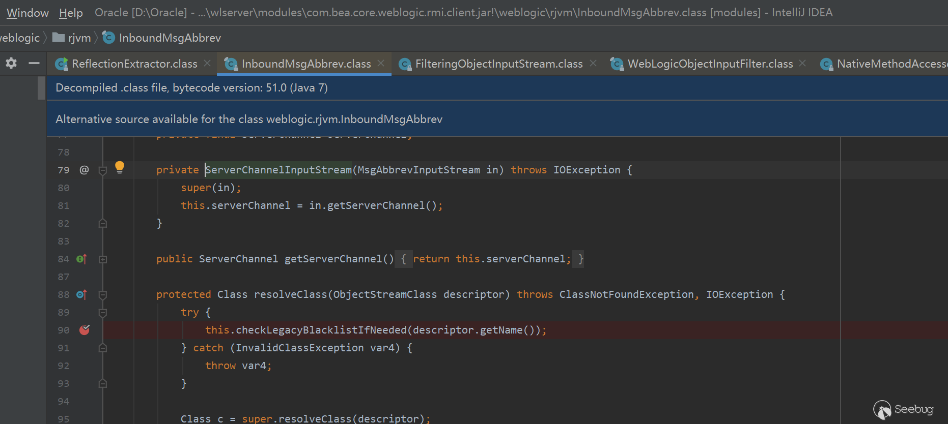 在serverChannelInputStream的resolvClass中,會對待反序列化的類檢查一下是否為weblogic黑名單中的類,并防止該類反序列化。這里就是傳說中的weblogic反序列化黑名單。