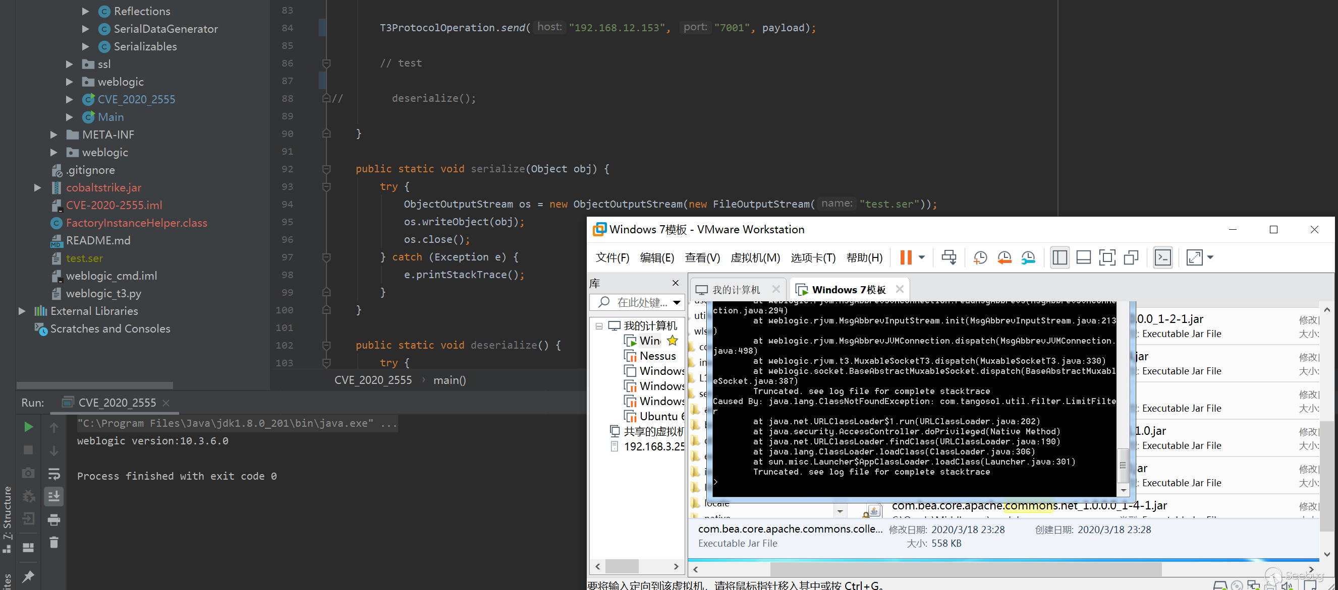 既然上面已經分析了,T3的話,我們可以使用cve-2020-2555的gadget去實現相關功能,最終觸發惡意類的綁定函數,成功綁定一個實例,并可以實現執行命令,如圖