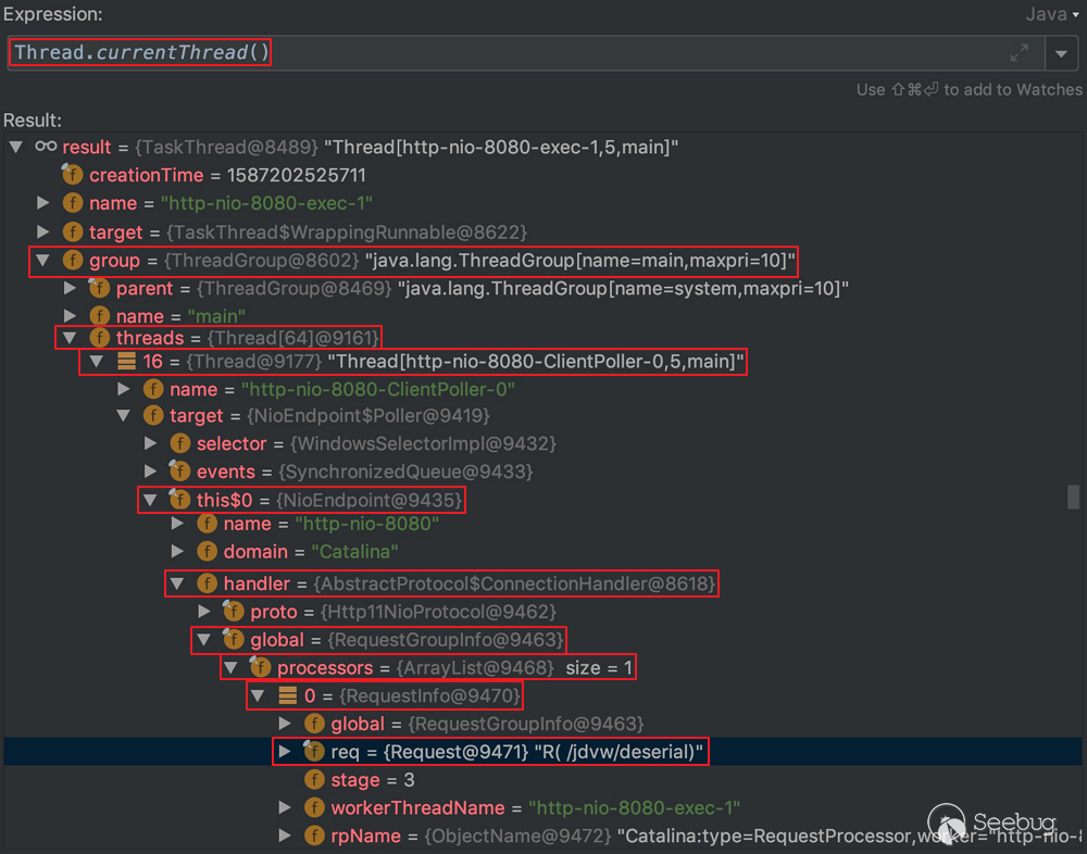按照經驗來講Web中間件是多線程的應用,一般requst對象都會存儲在線程對象中,可以通過Thread.currentThread()或Thread.getThreads()獲取。當然其他全局變量也有可能,這就需要去看具體中間件的源碼了。比如前段時間先知上的李三師傅通過查看代碼,發現[MBeanServer](https://xz.aliyun.com/t/7535)中也有request對象。