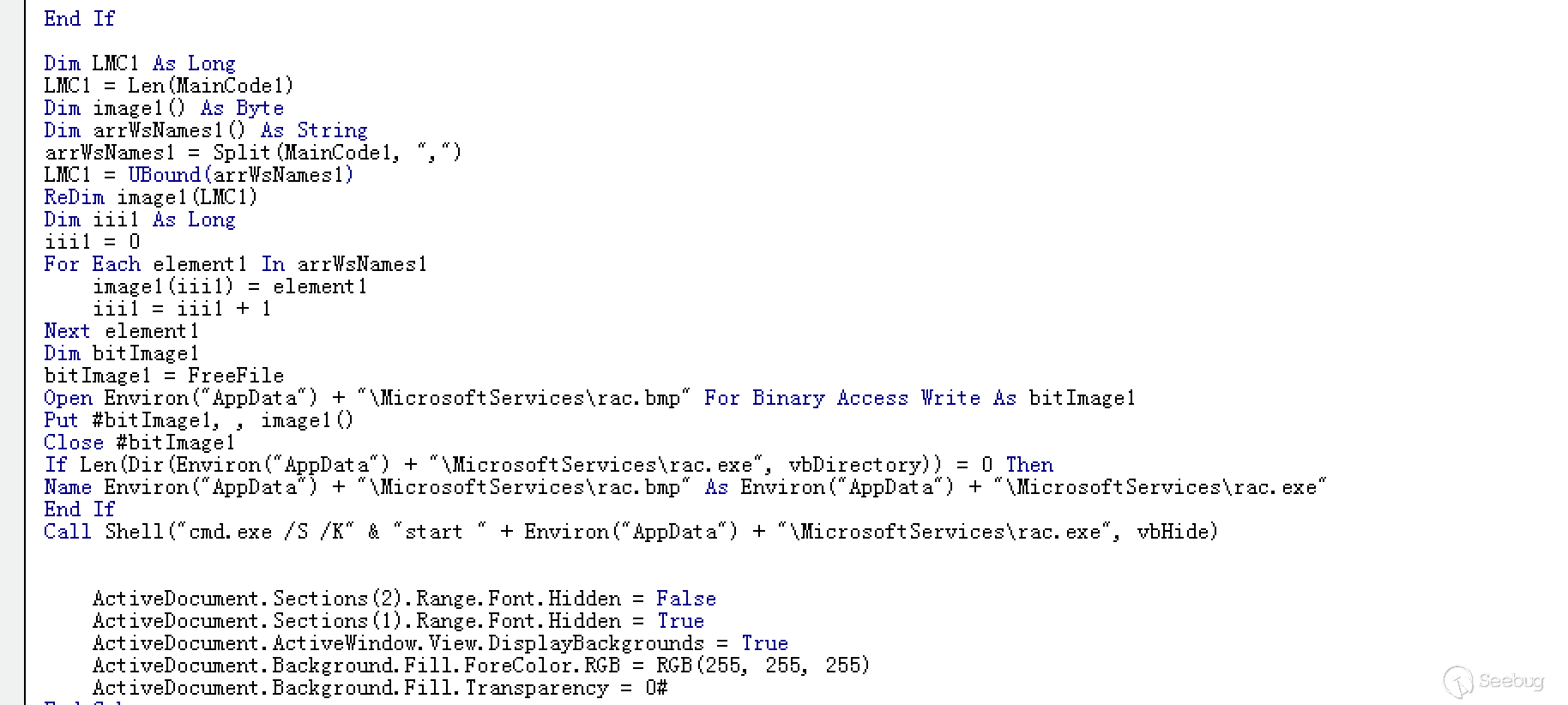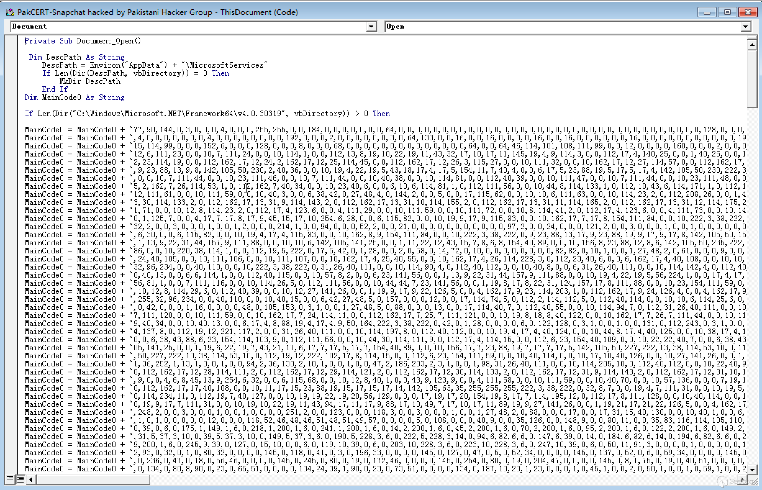此外還有個發現,依然是基于騰訊安全御見威脅情報中心去年的文章《疑似白象組織針對巴基斯坦、孟加拉國等南亞國家的最新攻擊活動報告》,文章中提到的白象的攻擊活動,該文件誘餌使用帶有宏的doc進行攻擊。我們同樣在庫里發現了類似的宏文件: