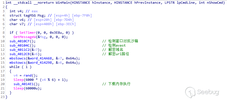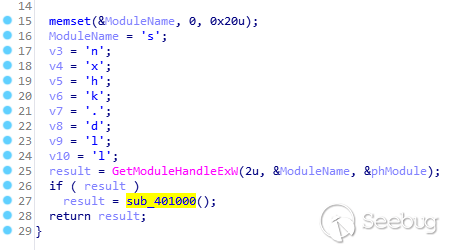 殺軟檢測:檢測snxhk.dll模塊(安全廠商Avast的相關文件),如果有則延時2分鐘: