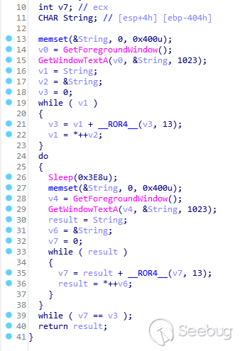 對抗沙箱:首先獲取最前端窗口,隨后每隔1秒鐘檢測最前端端口是否發生變化,如果不變則無限循環檢測: